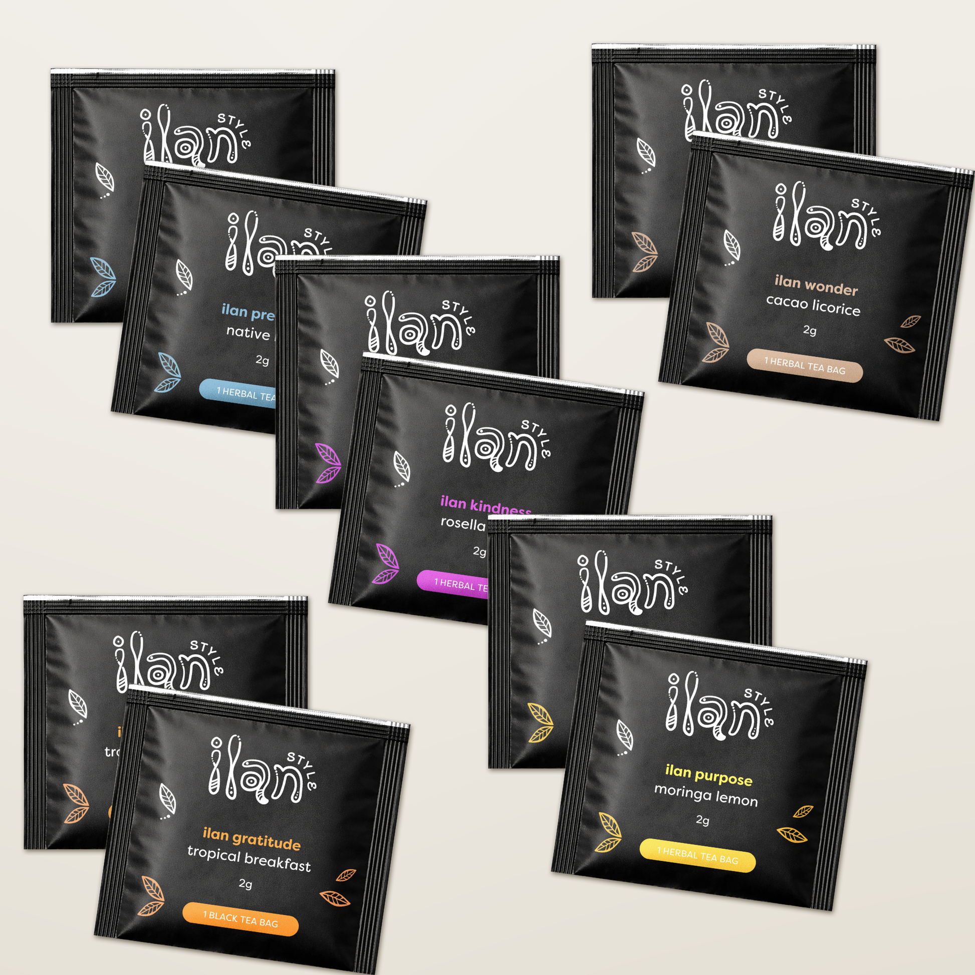 This curated set includes two individually wrapped tea bags of each of our five blends, giving you the chance to explore every flavour, intention, and experience Ilan Style has to offer.