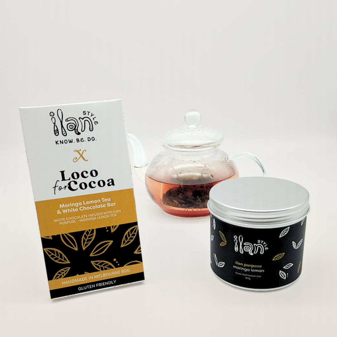 Moringa Lemon: Ilan Purpose - Moringa Lemon Tea + Moringa Lemon Tea & White Chocolate Bar
